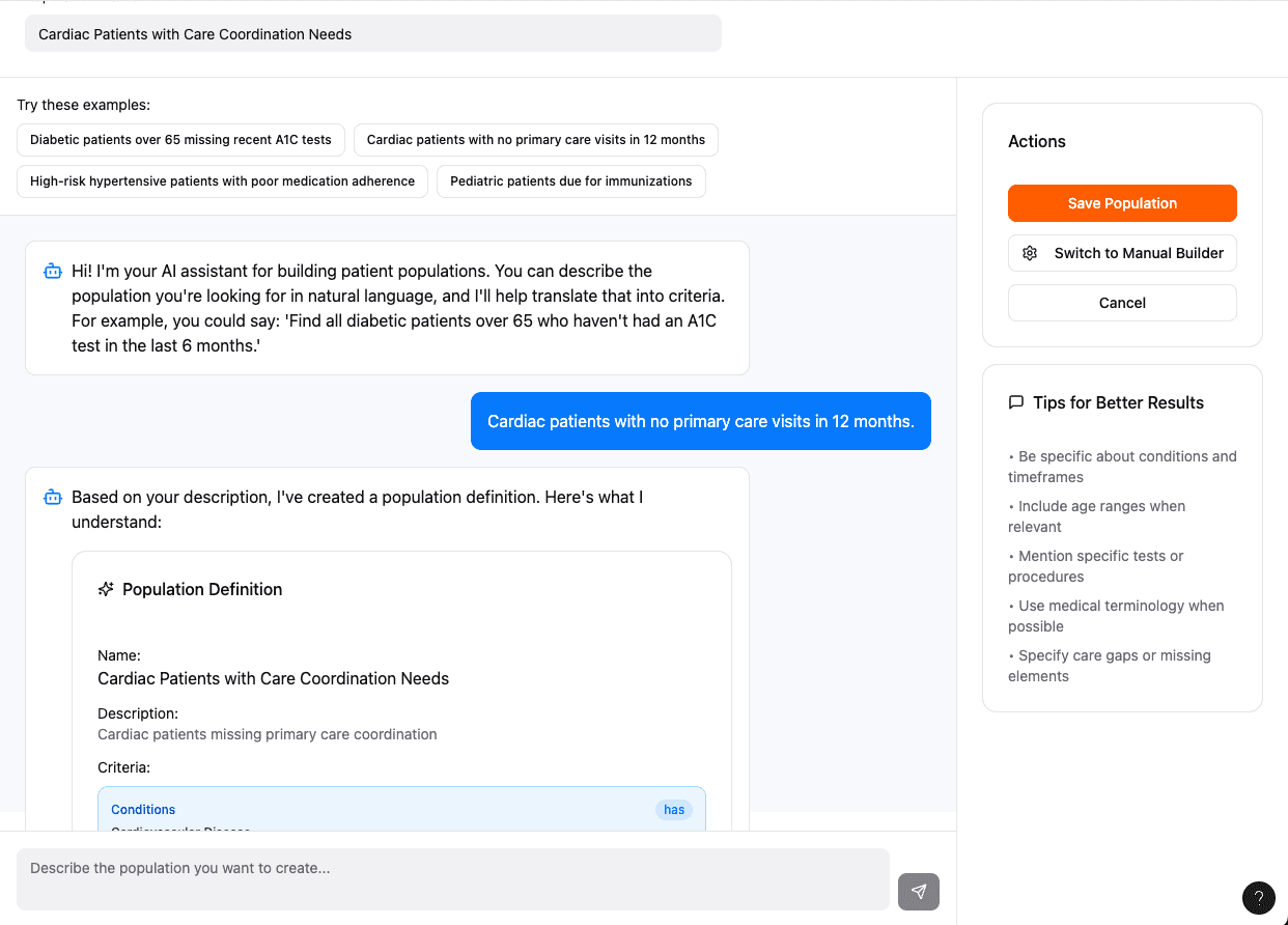 Describe the population you need-our AI builds it for you. Our conversational assistant instantly translates your intent into data-driven cohorts.