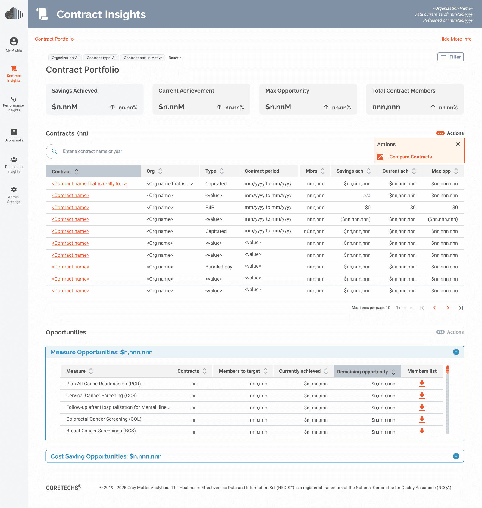 See current and past contracts for analysis of best practices and performance comparisons to inform current care delivery, management and future contract negotiations.